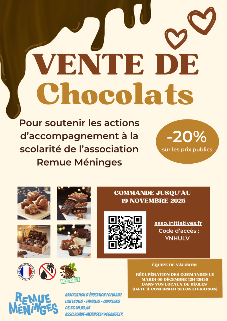 A l’occasion des fêtes de fin d’année, Remue Méninges organise une vente de chocolats.Fabriqués en France, ils sont sans huile de palme et 100% pur beurre de cacao. N’hésitez pas à consulter notre catalogue en ligne : https://it4v7.interactiv-doc.fr/html/Catalogue_Saveurs_Chocolats_pdf_735Vous bénéficiez d’une réduction de 20% de remise sur tout le catalogue, l’occasion d’offrir ou de se faire plaisir. […]